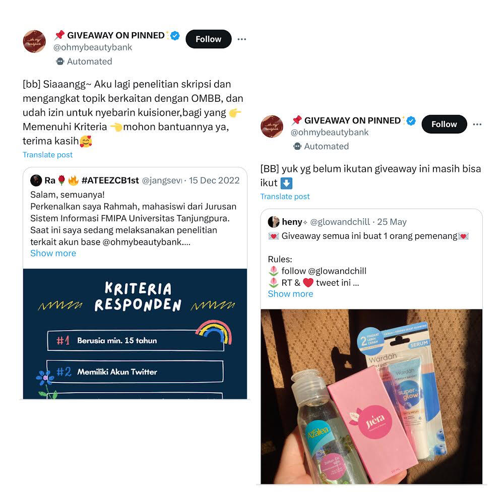 18. Menfess promosi GIVEAWAY dan/atau menyebar KUESIONER diperbolehkan 1x/hari per akun dengan format sebagai berikut:Sila posting GA/tweet kuisioner di akun pribadi lalu kirim dengan menyematkan link tweet seperti foto di bawah. Topik giveaway atau kuesioner harus relevan dengan ombb. Dilarang giveaway barang preloved atau TIDAK NEW.