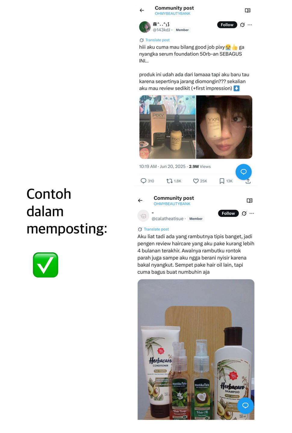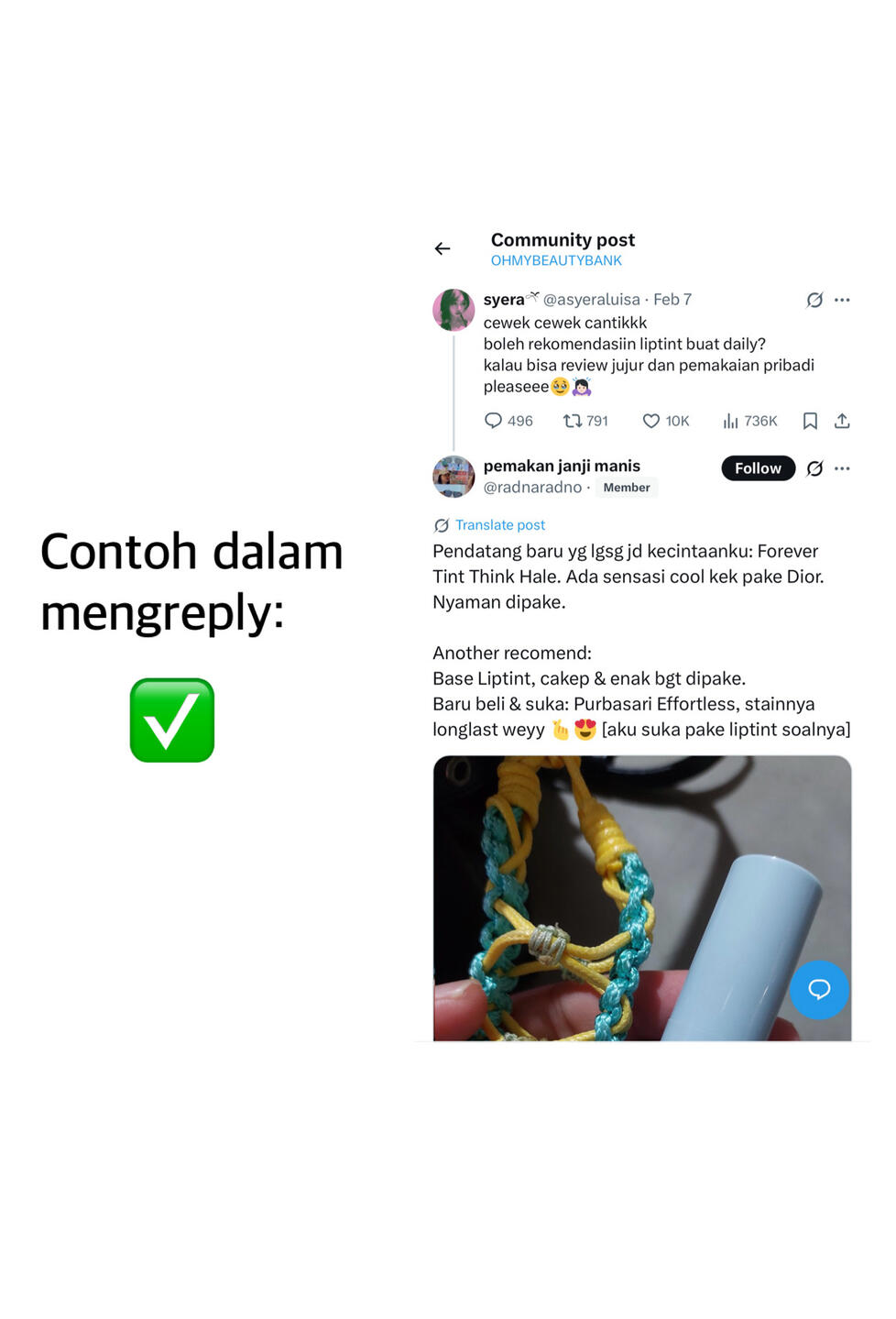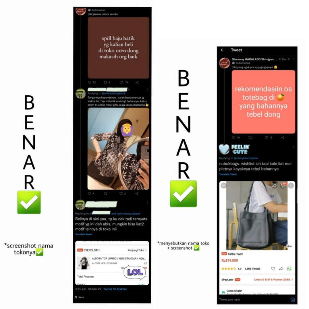 • Dilarang membalas dengan format seperti: “cek threadnya di profil aku ya, kak” “kalau mau linknya dm aja” atau kalimat serupa. Baik di kolom replies maupun quotes.Contoh format yang diperbolehkan: